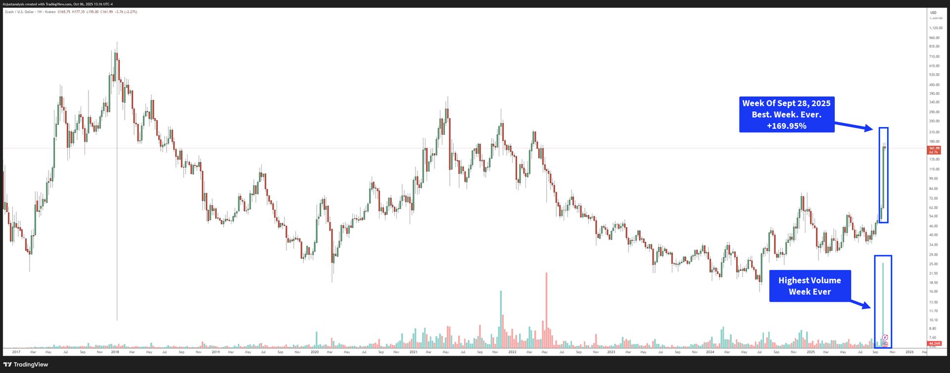 $ZEC.X ( ā¼ 2.25% ) had a stupidly insane week last week. How good was it?