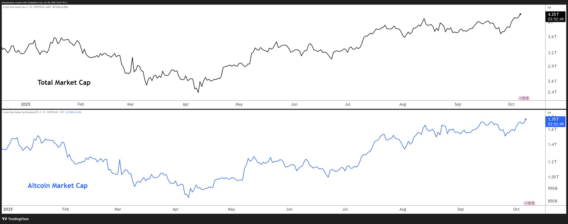 And hereās a look at cryptoās total market and altcoin market cap charts: