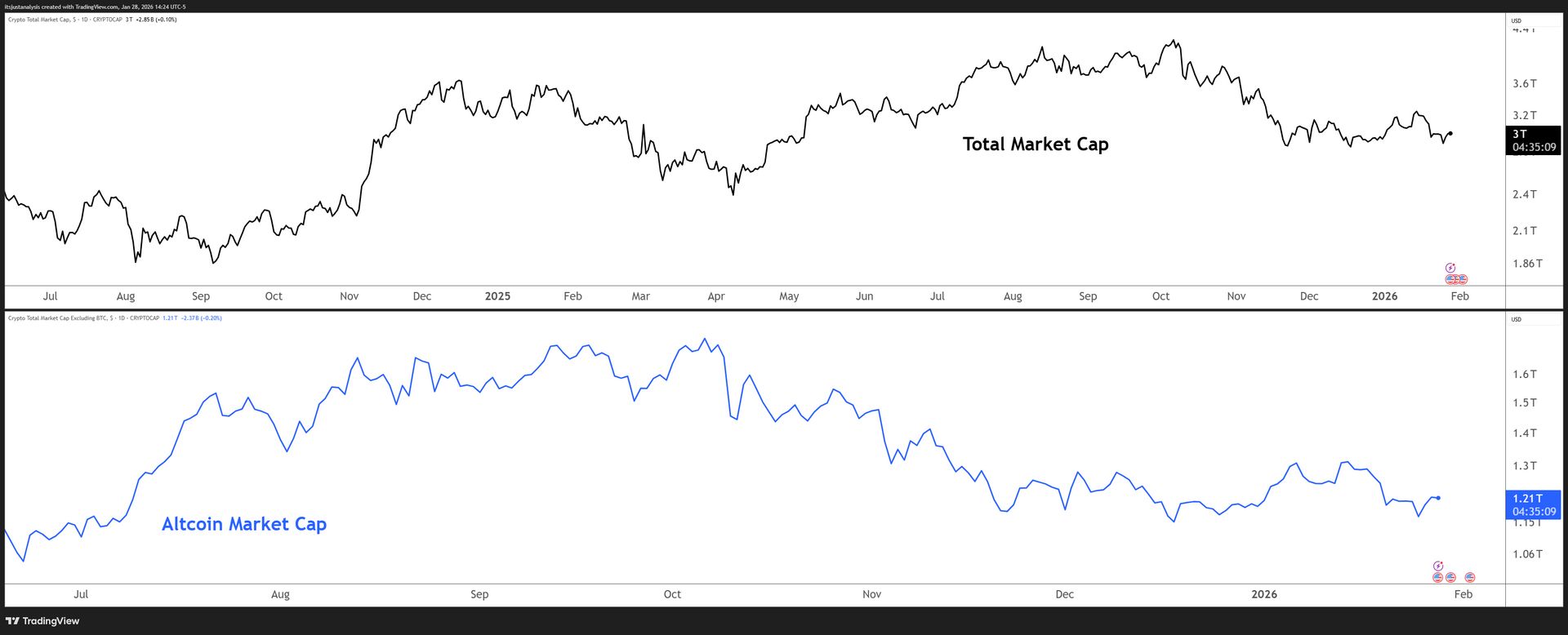 And here’s a look at crypto’s total market and altcoin market cap charts: