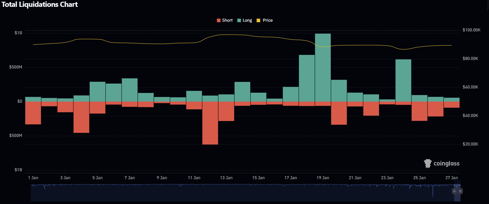 But none of that compared to what came next. January 18-19 produced the month's defining liquidation event: $1.67 billion in long liquidations over 48 hours ($681M + $991M).