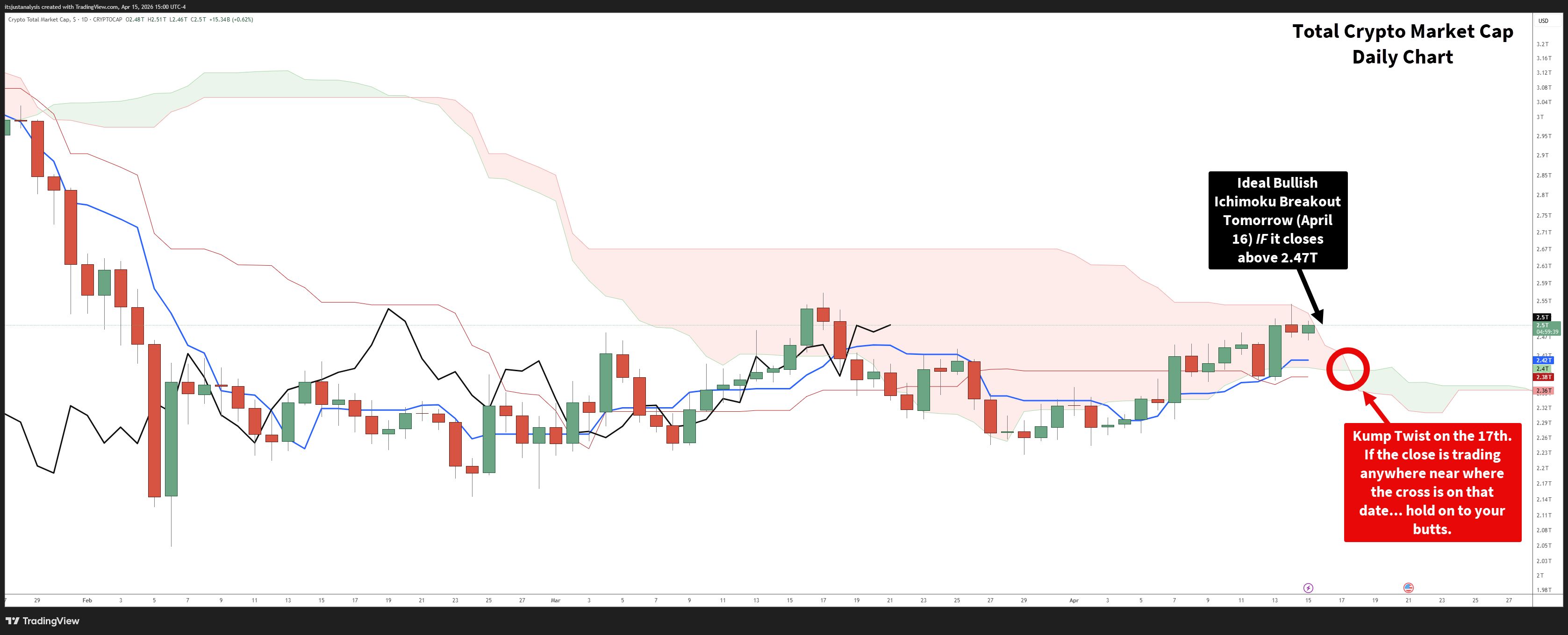 All of the conditions for that setup to be considered true will occur when the daily candlestick closes above the Cloud. Today, that would require a close above $2.52T. For tomorrow (April 16), that drops to $2.45T.