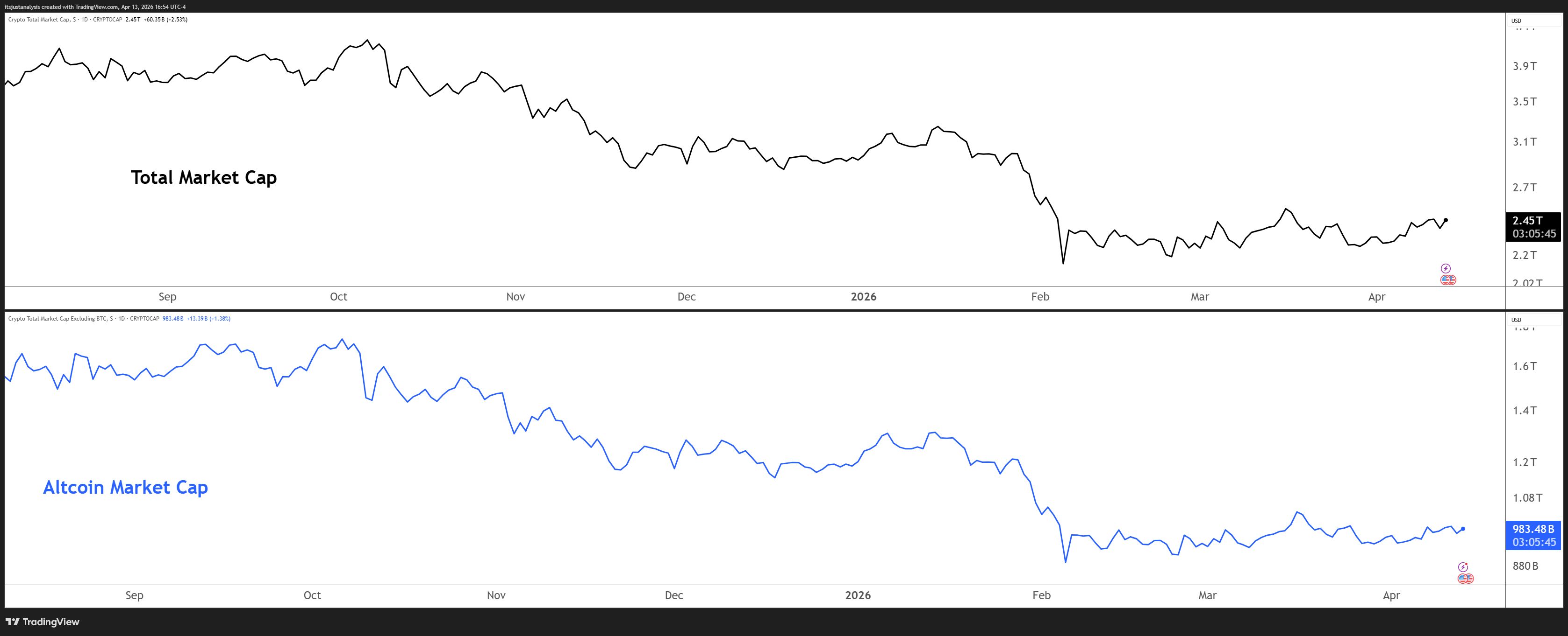 Before we dive in, here’s today’s crypto crypto’s total market and altcoin market cap charts: