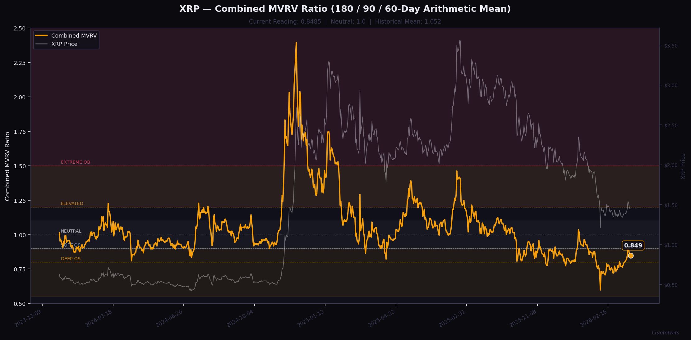 Near-term lean: oversold but range-bound. XRP has the highest mean-reversion potential of the group given its historical MVRV range, but that potential has been sitting there unrealized for two months. 📆