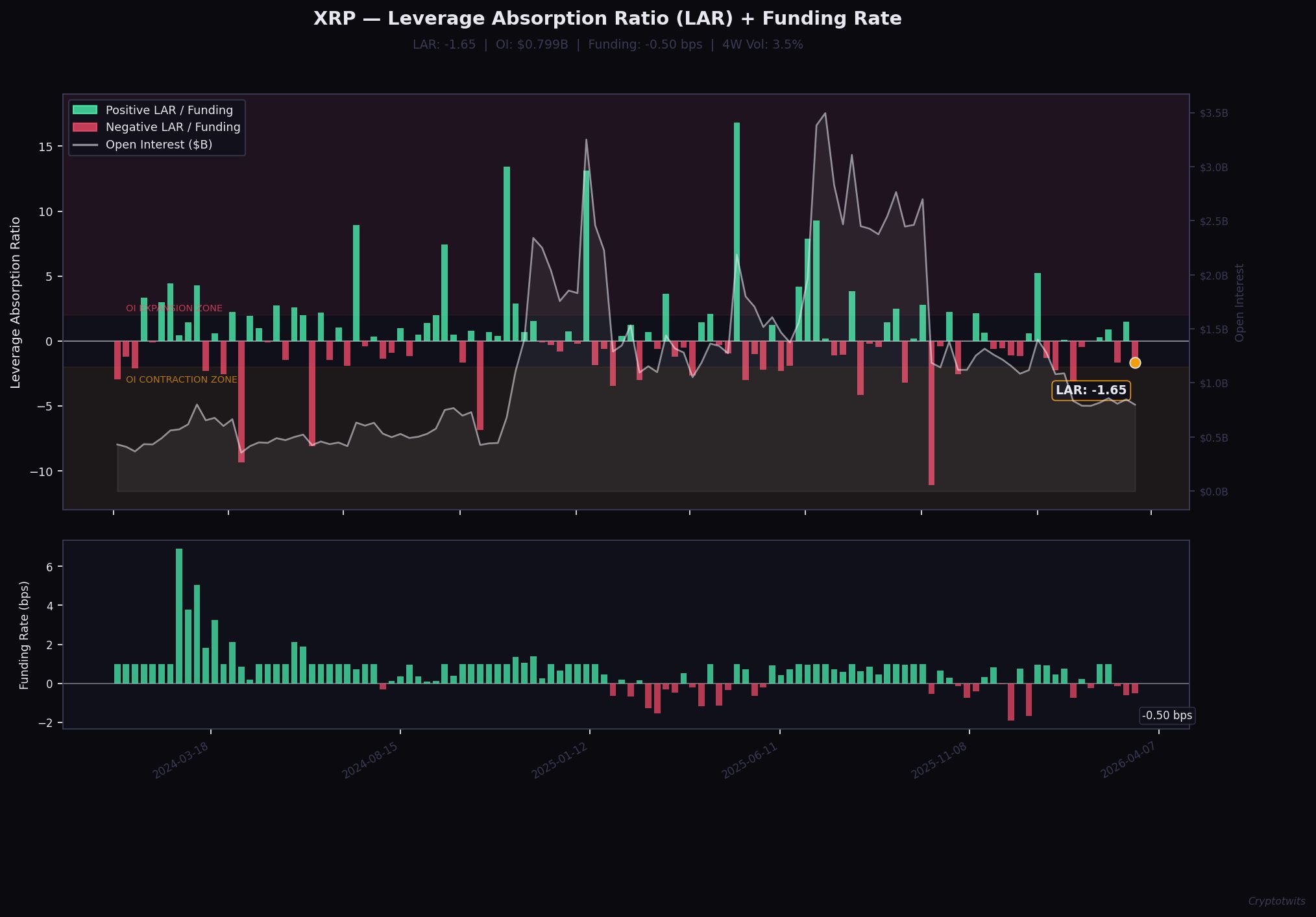 XRP's LAR has oscillated between mild expansion and contraction since the February floor without establishing any directional conviction. The late-January flush was severe at -3.13, but it wasn't the worst reading in this dataset, and the structural cleanup since then has been partial at best.