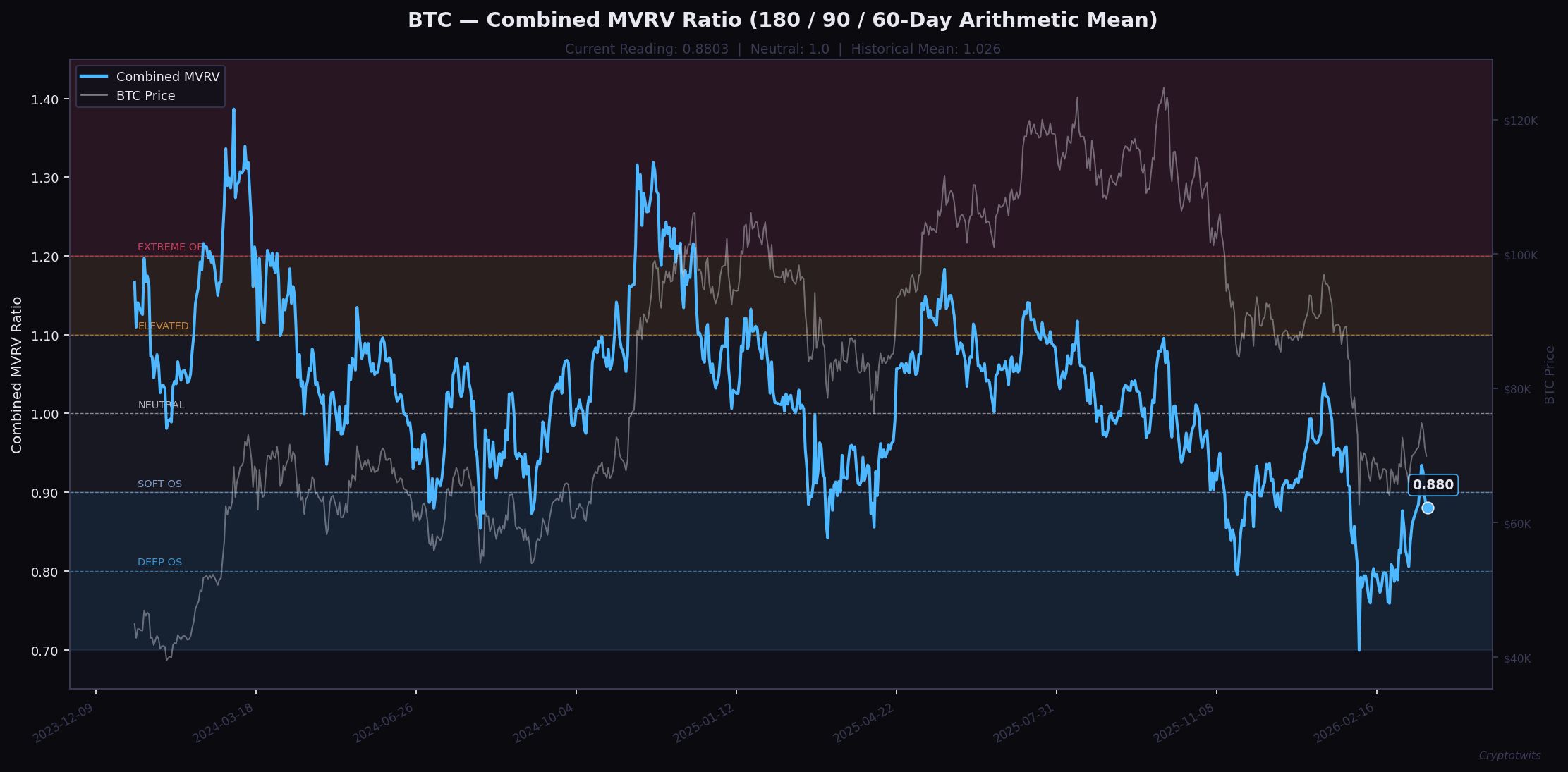 BTC’s combined MVRV is sitting at 0.879 and is currently below the 1.0 line for the fourth consecutive week, meaning the average coin acquired across all three lookback windows is currently held at an unrealized loss relative to its cost basis.