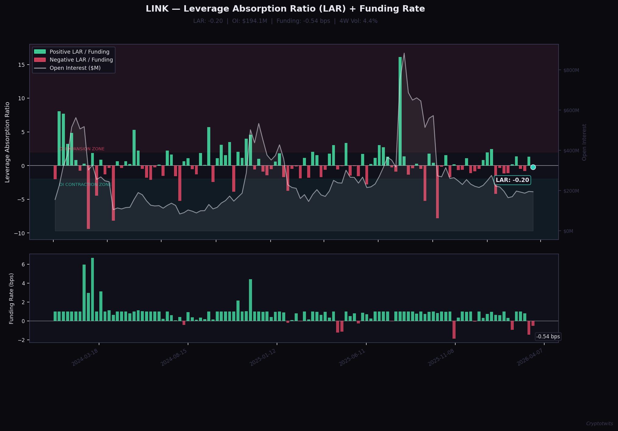 Total open interest in LINK is thin - $194 million as of March 19, an order of magnitude smaller than ETH's $11B and a fraction of BTC's $21B. Thin OI markets amplify LAR swings in both directions without necessarily reflecting genuine structural change.