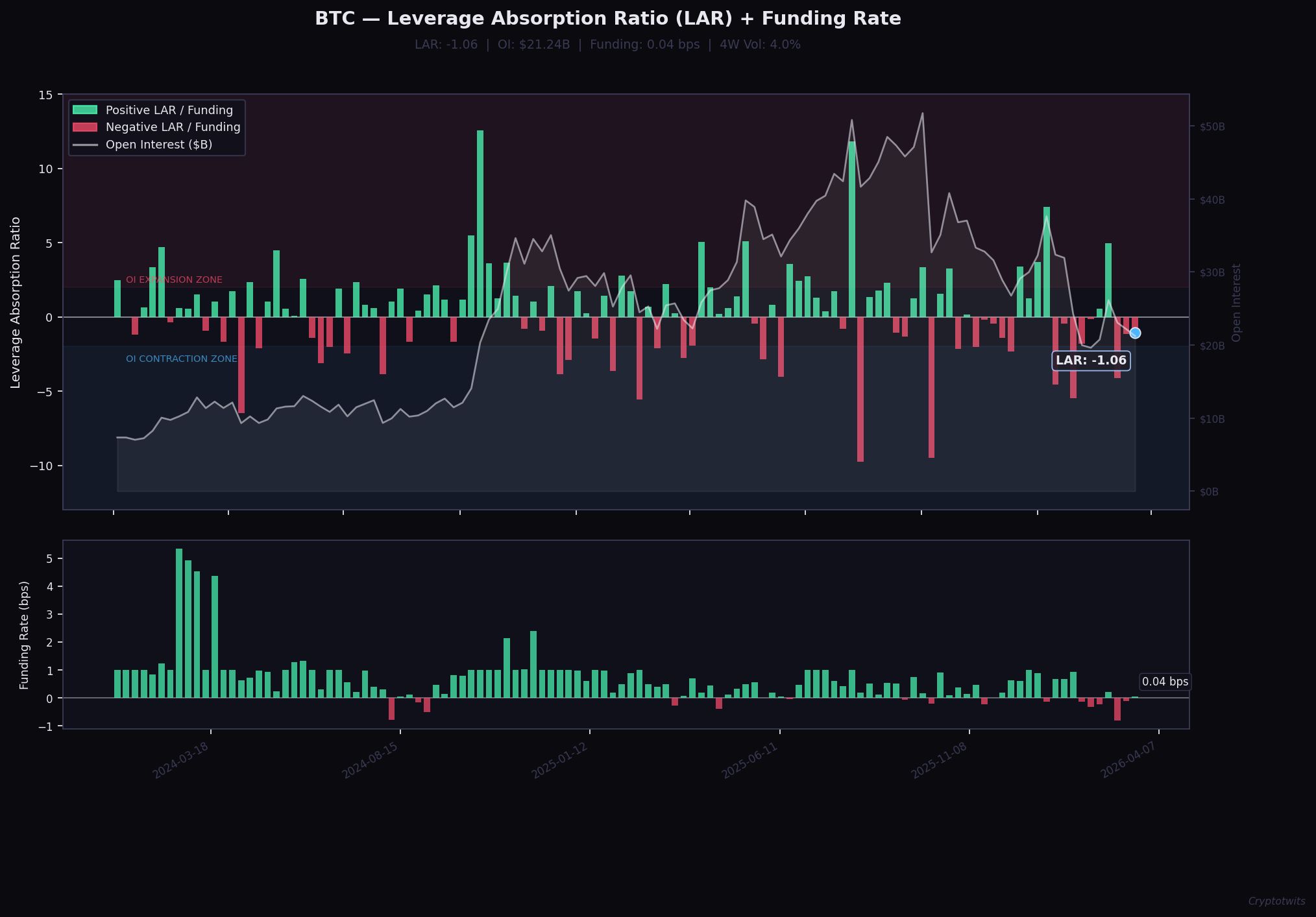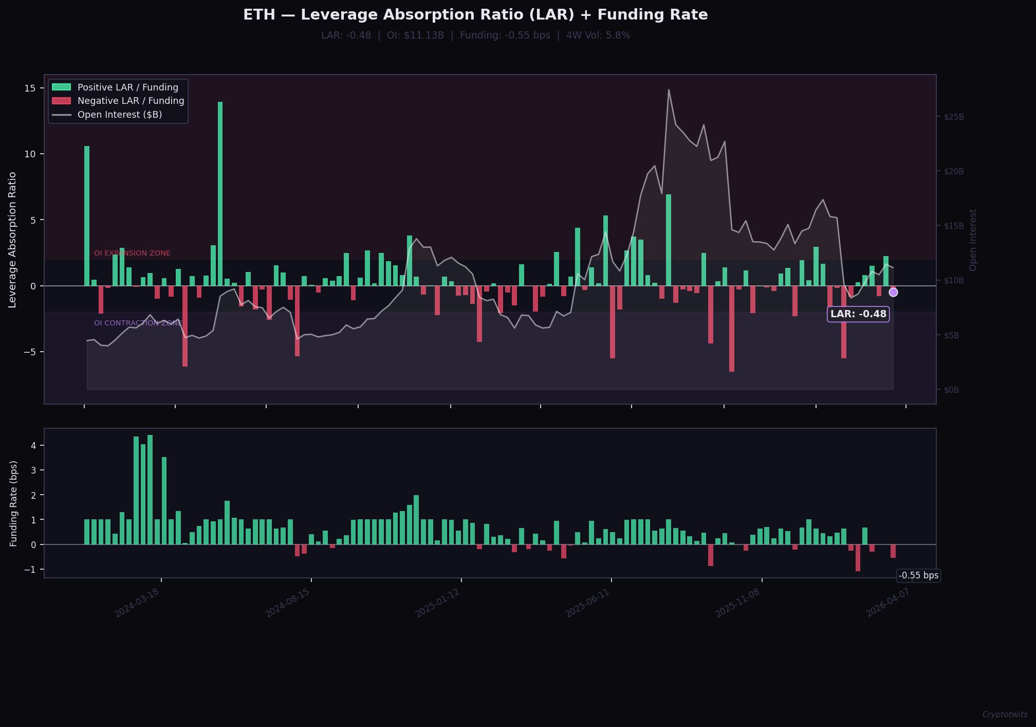 The LAR registered its most violent contraction in the late-January window at -5.53, triggered by the same macro shock that clipped BTC's OI. Since then, ETH's LAR has oscillated without building durable positive momentum.