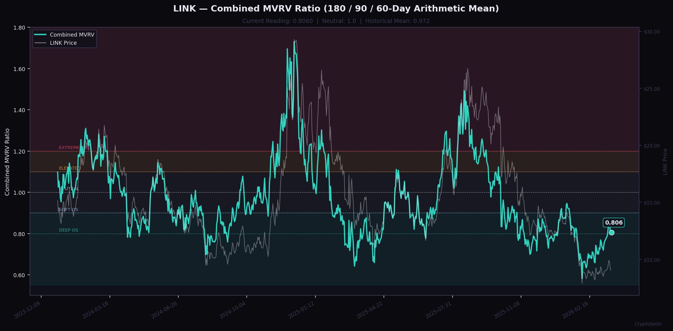Chainlink's average cost basis environment since 2024 is structurally more compressed than Bitcoin's or Ethereum's, so reading 0.806 against its own historical norm (well, since 2024 at least) is a worse signal than the raw number implies when viewed in isolation. 😱