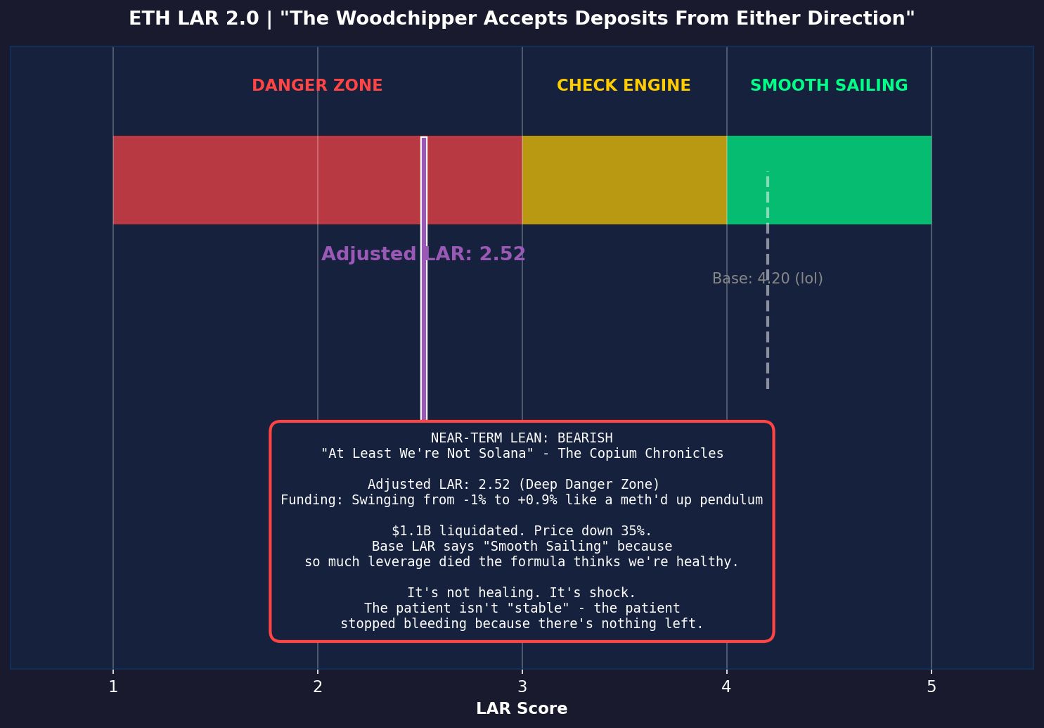 The base LAR reads 4.20 - "Smooth Sailing." You know why? Because so much leverage got obliterated that the formula thinks we're healthy now. It's like saying a patient is cured because the disease killed them. Technically the metrics improved! 🙂