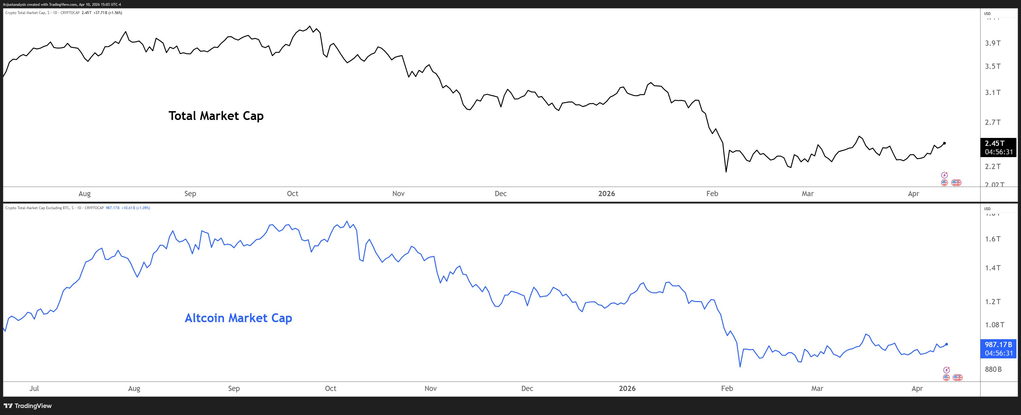 Before we dive in, here’s today’s crypto crypto’s total market and altcoin market cap charts: