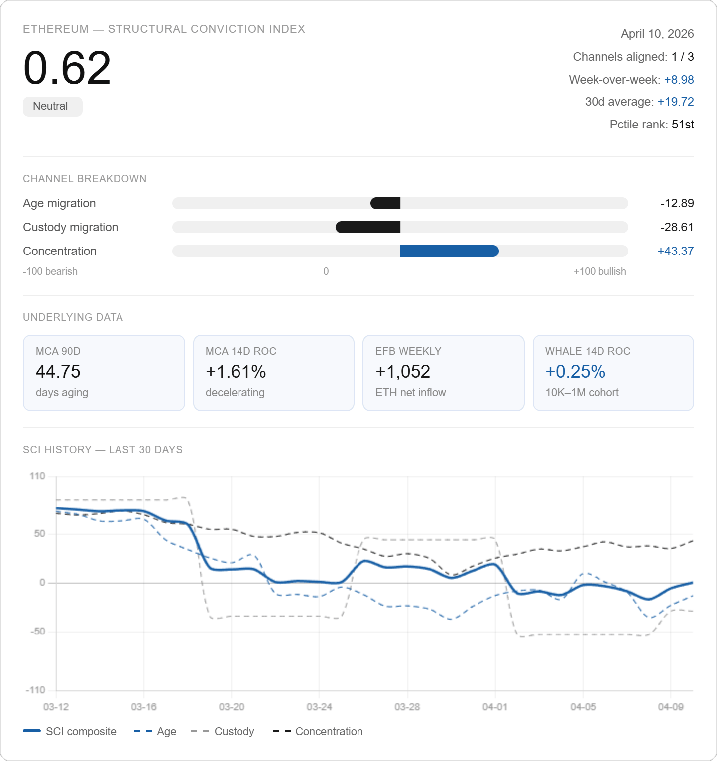 Where XRP's age channel is doing all the heavy lifting, ETH's is the concentration channel. The large ETH holders (wallets in the 10,000-to-1,000,000 ETH range) grew 0.25% over 14 days while smaller retail holders grew 0.81%.