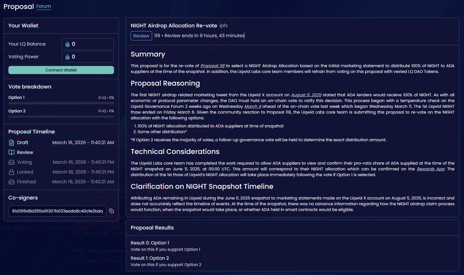 Then the first thaw date arrived in early March 2026 and instead of distributing, Liqwid co-founder Dewayne Cameron posted a temperature check on the governance forum and vote over what to do with the NIGHT.