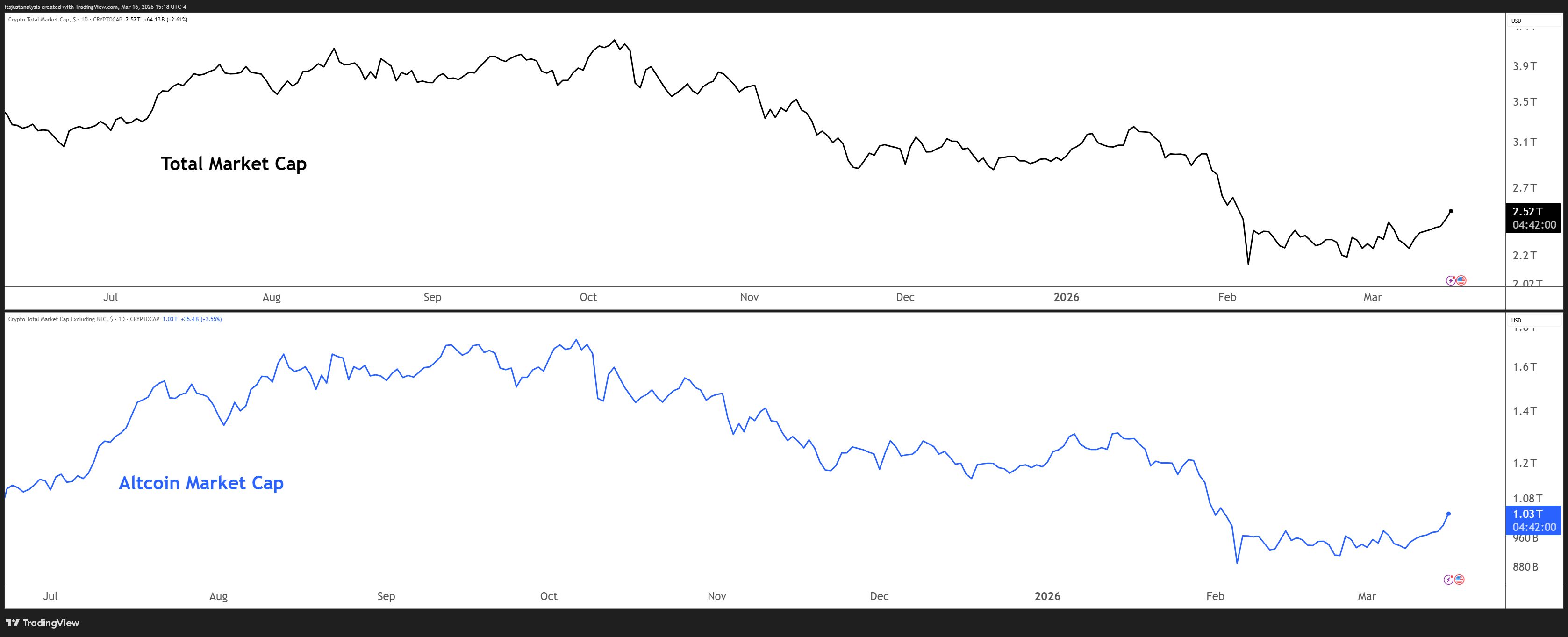And here’s a look at crypto’s total market and altcoin market cap charts: