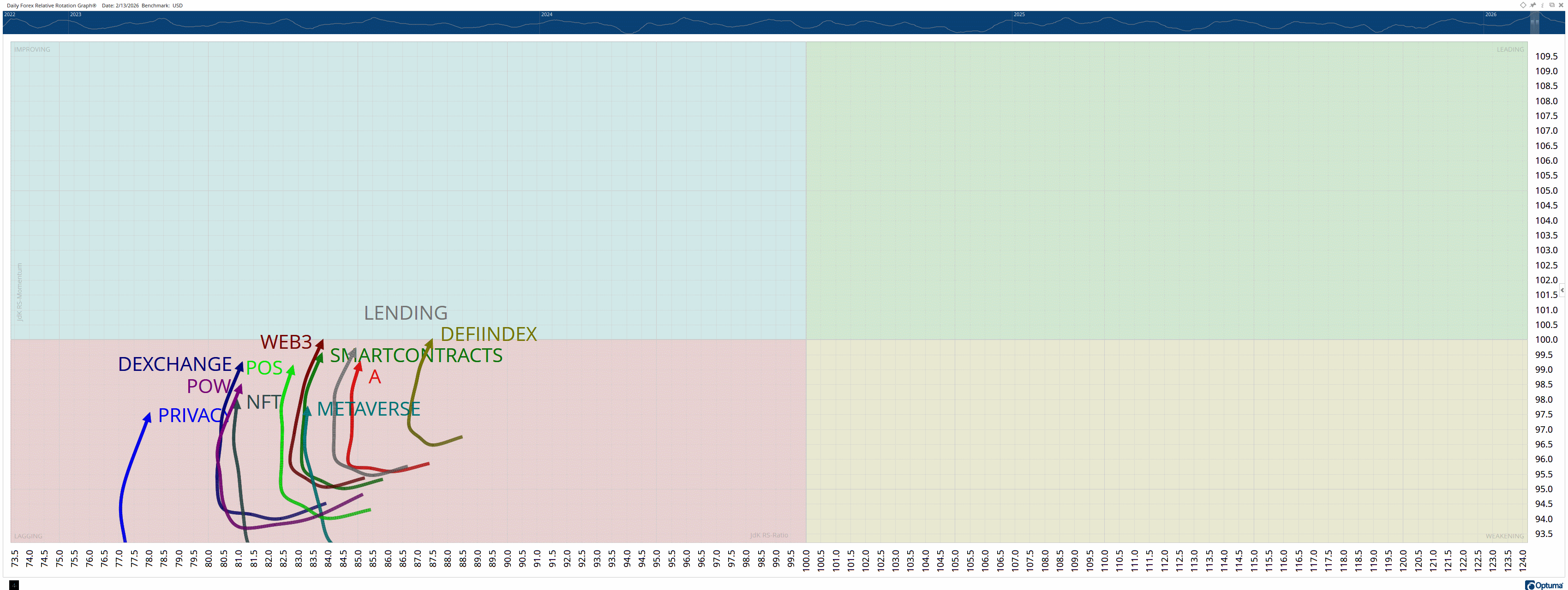 Relative Rotation Graphs (RRG) help us visualize how a currency or sector performs compared to a benchmark - in this case, the U.S. Dollar Index (DXY). Think of the four colored sectors as stages in a race: