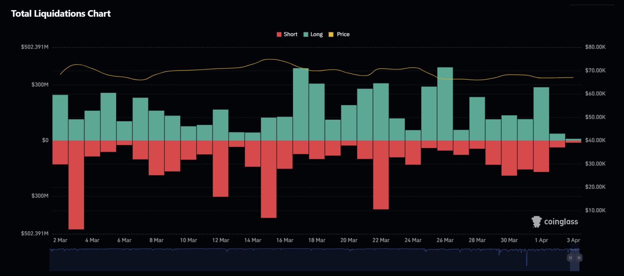 Late March (Mar 30 - Apr 1) - Multiple medium long liquidations ($200M-$300M) as price stalls and dips.