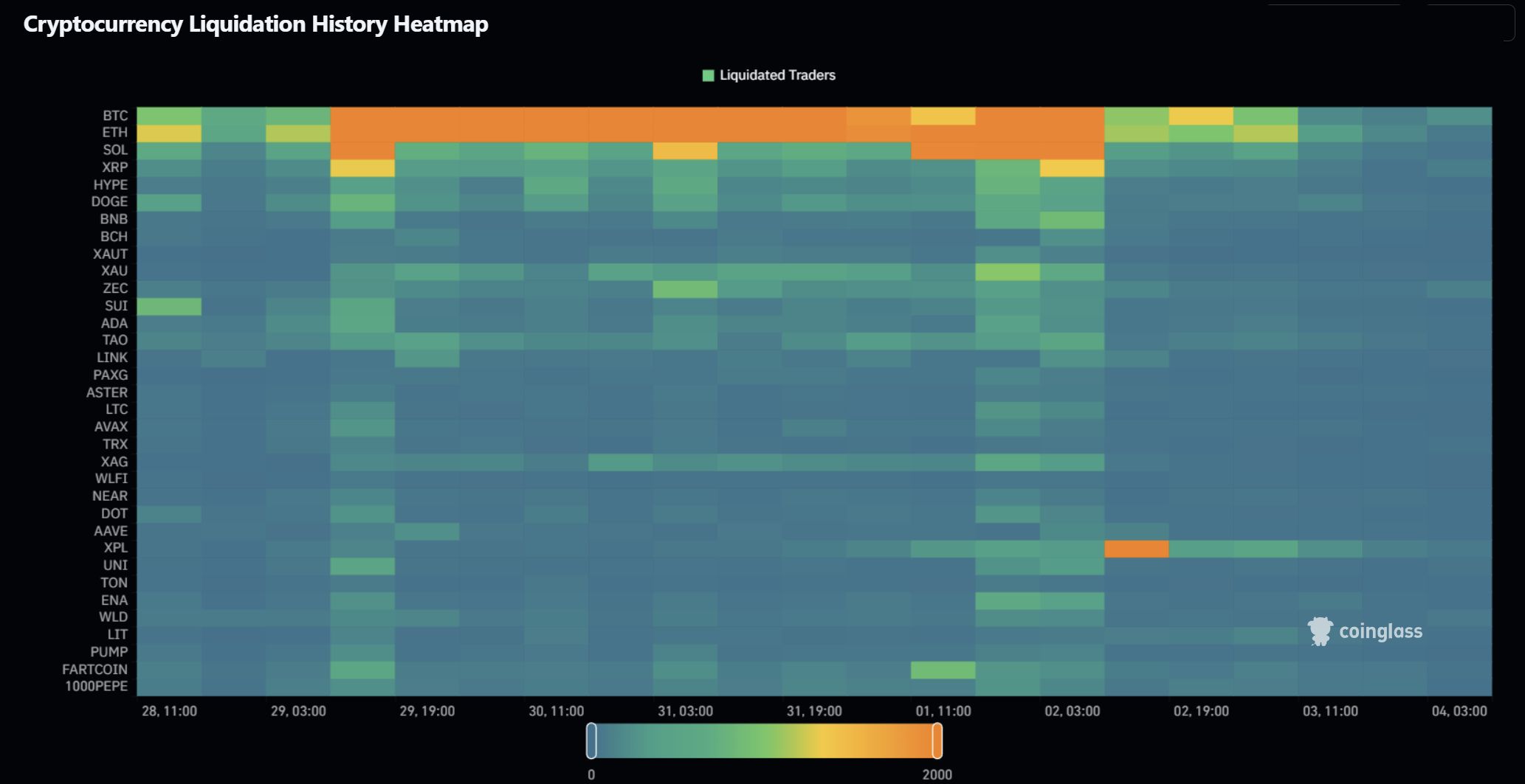 Color = head-count of forced liquidations (legend tops at 2,000).