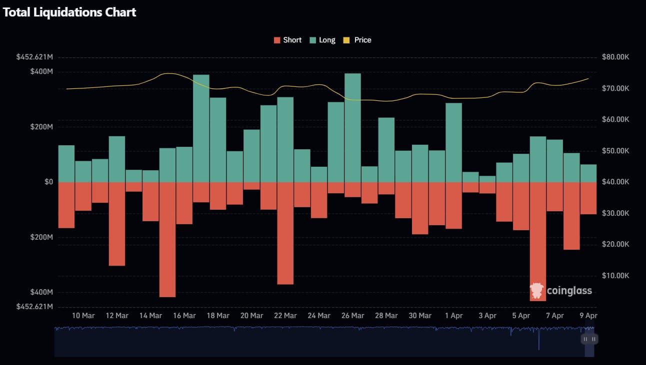Apr 6 - Apr 7 - Notable short liquidation spike ($400M), probably the cleanest squeeze late in the window.