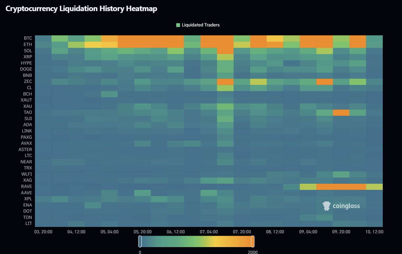 Color = head-count of forced liquidations (legend tops at 2,000).