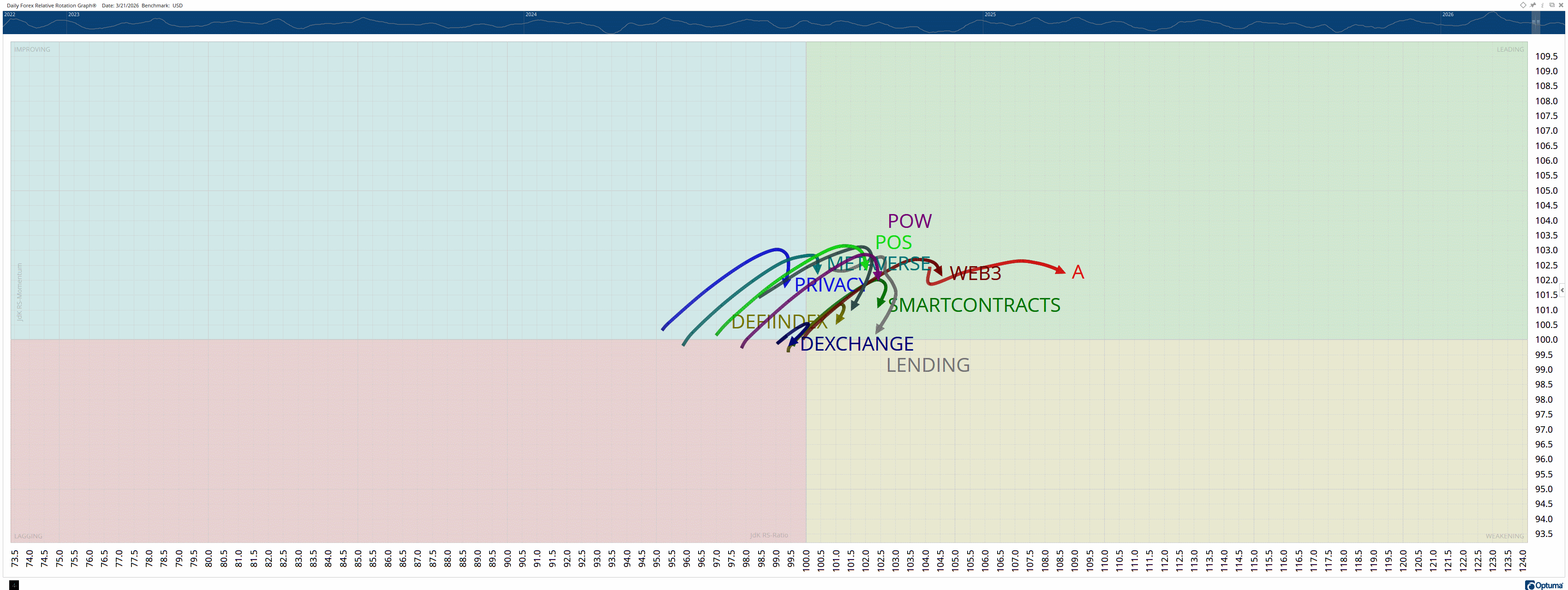 Relative Rotation Graphs (RRG) help us visualize how a currency or sector performs compared to a benchmark - in this case, the U.S. Dollar Index (DXY). Think of the four colored sectors as stages in a race: