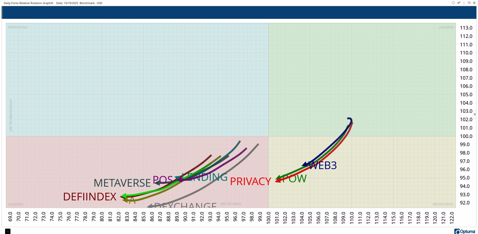 Relative Rotation Graphs (RRG) help us visualize how a currency or sector performs compared to a benchmark - in this case, the U.S. Dollar Index (DXY). Think of the four colored sectors as stages in a race: