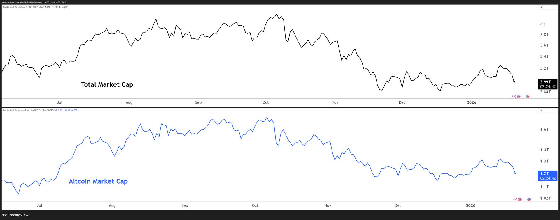 And here’s a look at crypto’s total market and altcoin market cap charts: