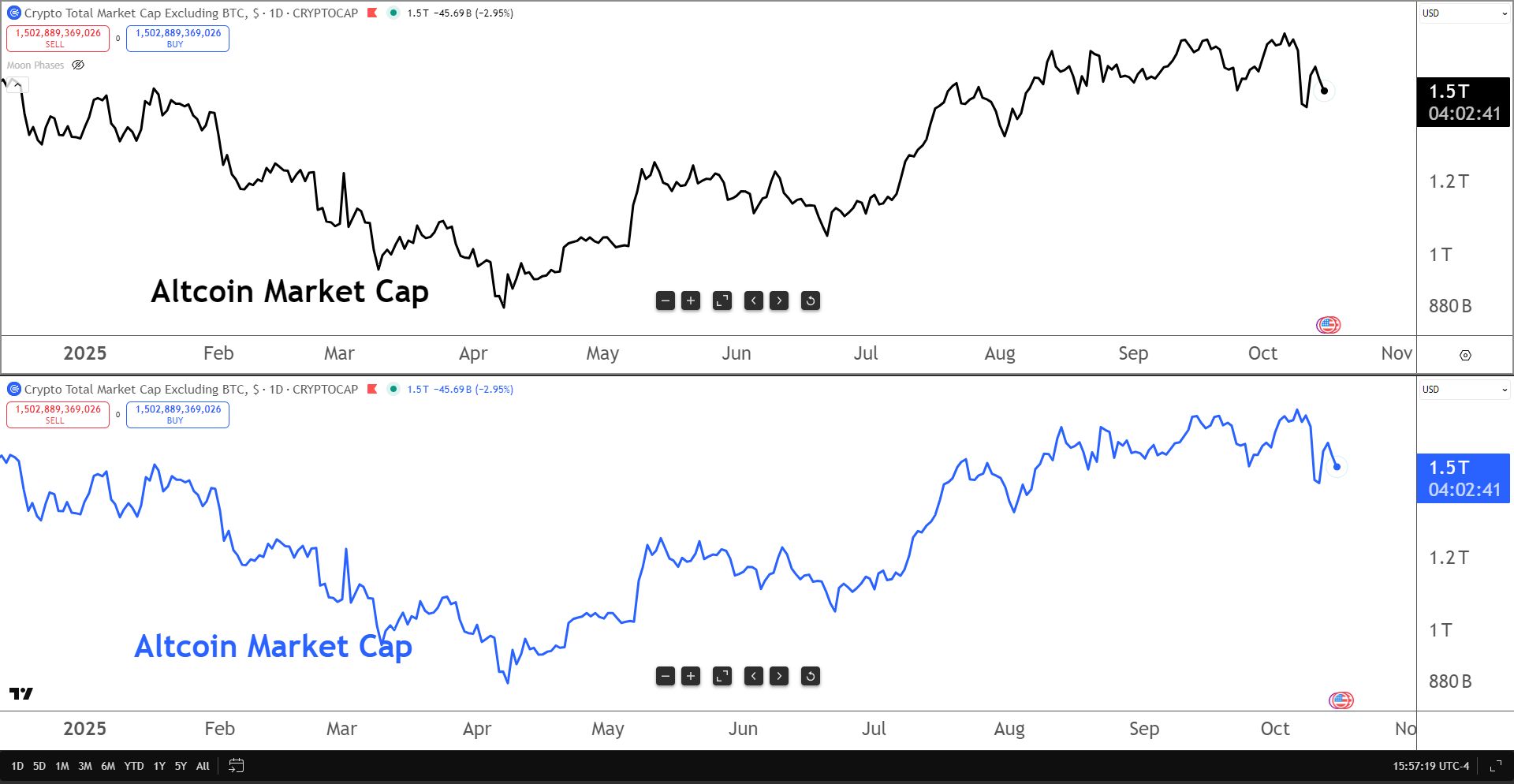 And here’s a look at crypto’s total market and altcoin market cap charts: