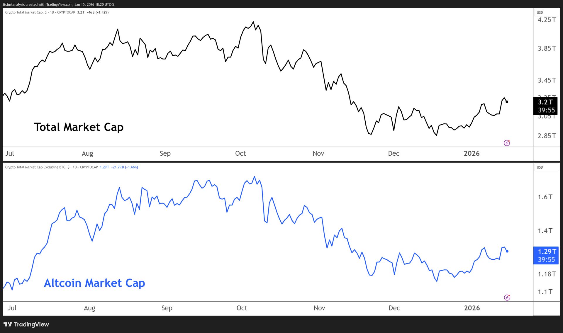 And here’s a look at crypto’s total market and altcoin market cap charts: