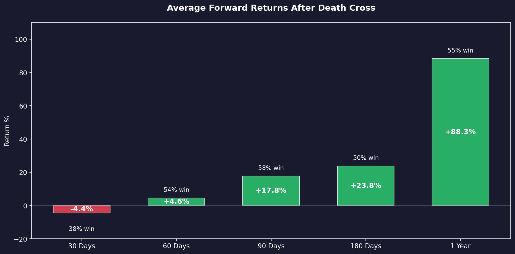 Every single death cross price has eventually been exceeded. 100%* recovery rate. If you bought every death cross and held - you made money every time. The catch: you needed conviction to sit through drawdowns as deep as -67%. πΆ