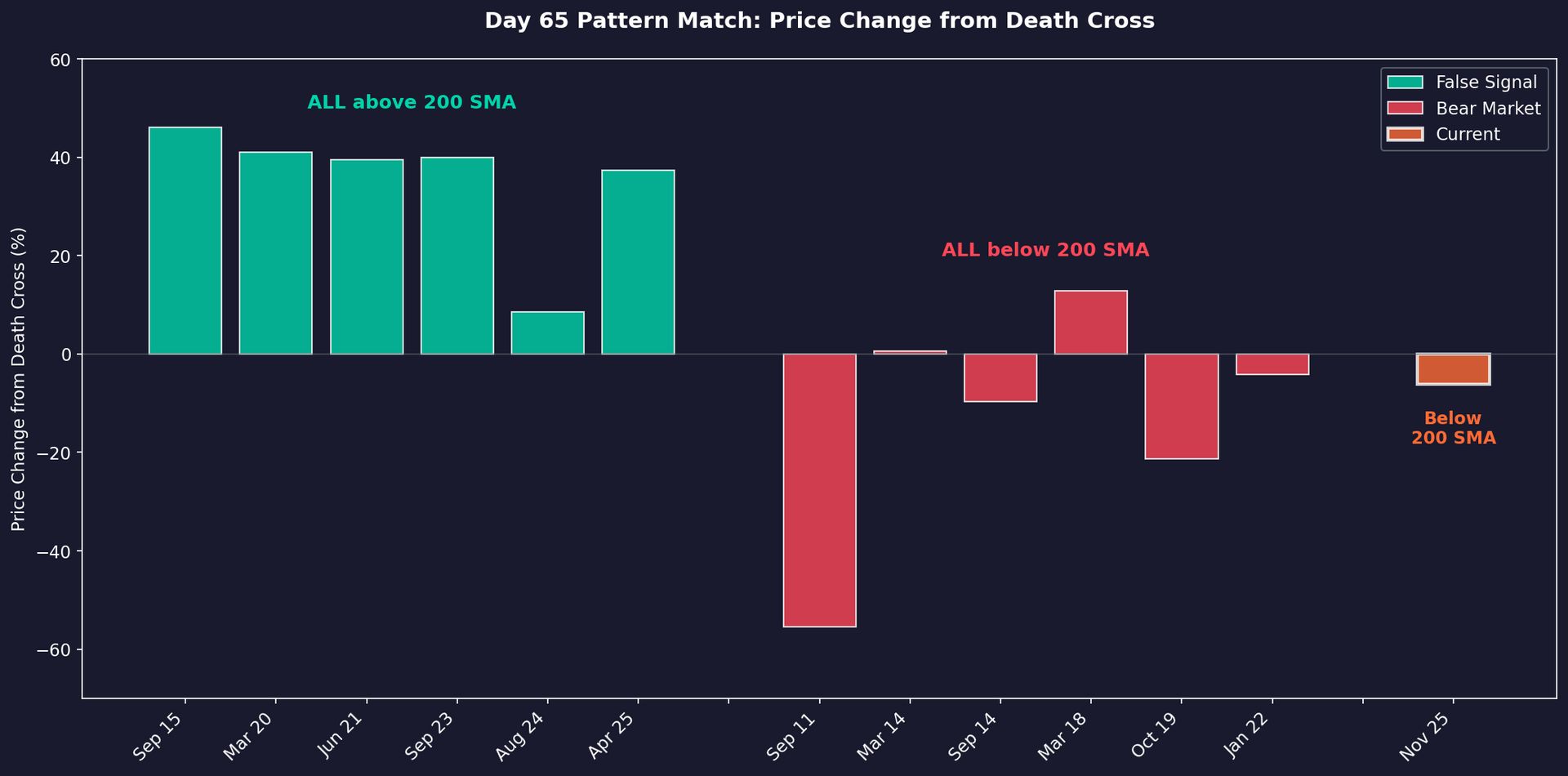 Every false signal had reclaimed the 200 SMA by day 65. This one hasn't.