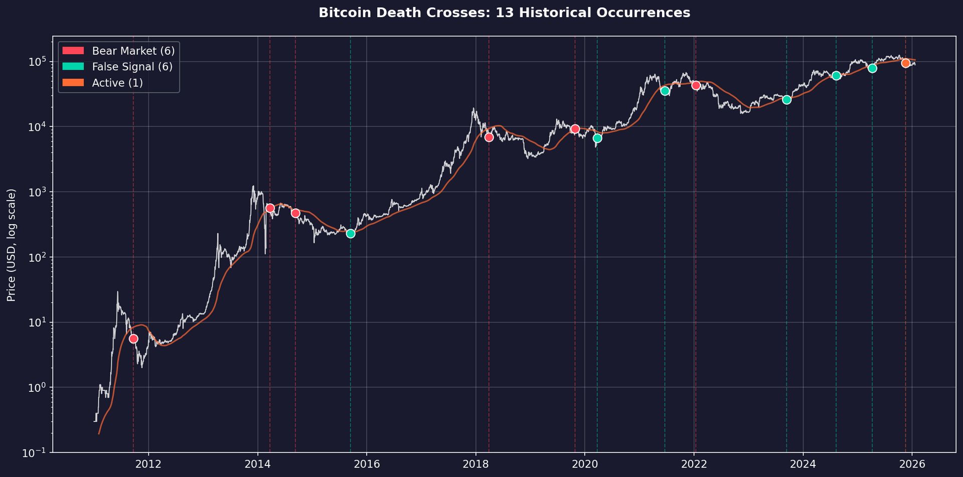 The death cross gets headlines every single time. Bitcoin's 50-day moving average crosses below the 200-day and suddenly everyone's a bear.