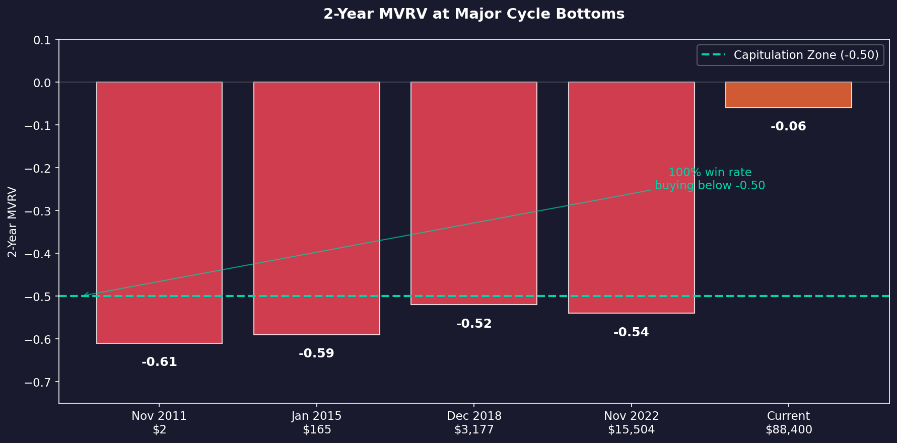 The 2-year MVRV compares market cap to realized cap - measuring whether holders are in profit or loss vs their cost basis. When it goes deeply negative - capitulation.