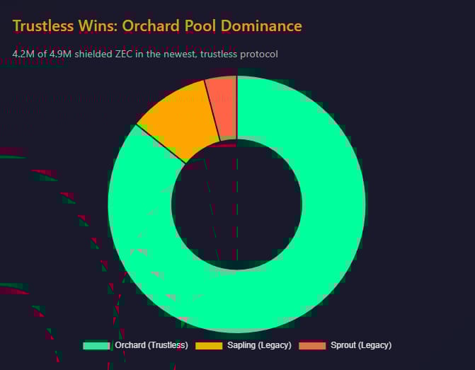 Orchard dominance. North of 4.2M ZEC rests in the trustless pool, not the legacy ones. That’s where careful money goes. And honestly, I can’t fathom why this isn’t more of a big deal in crypto social.
