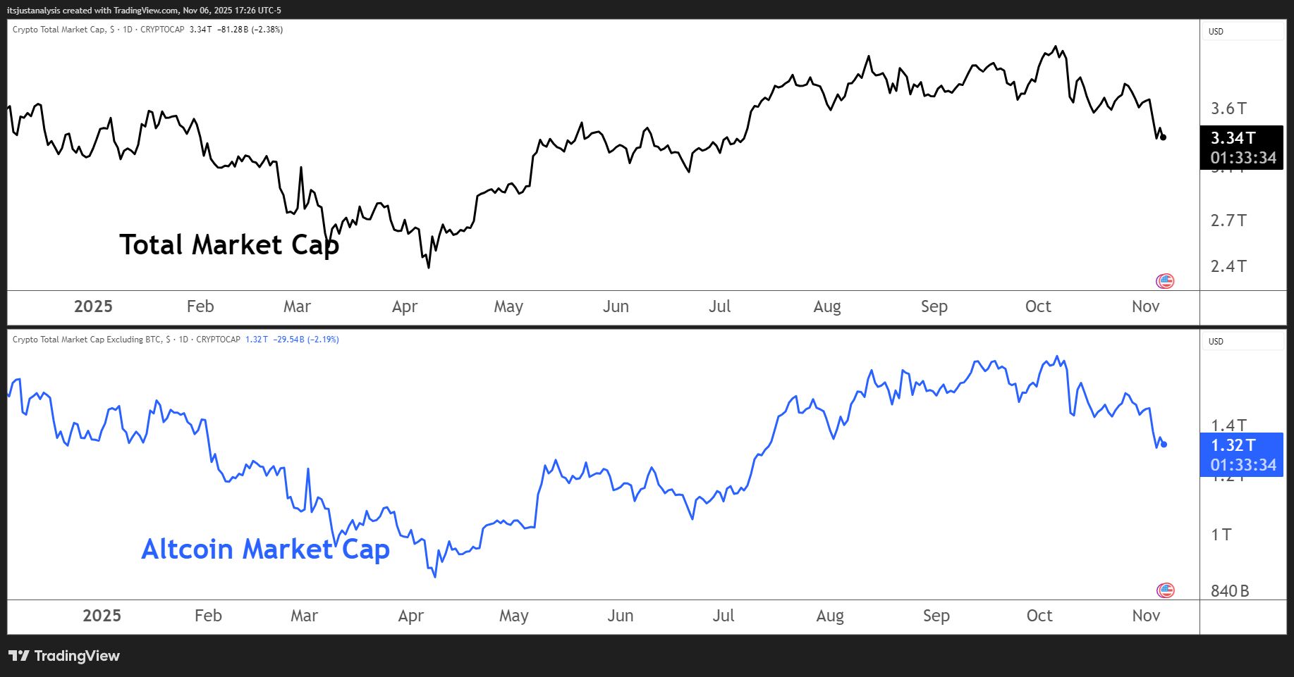 And here’s a look at crypto’s total market and altcoin market cap charts: