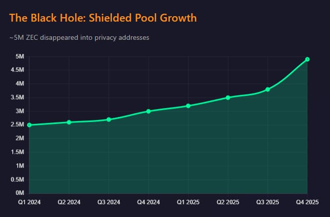 Shielded supply hit ~4.9-5.0M ZEC. About 30% of supply by early November. That’s up from the low teens in early 2024.