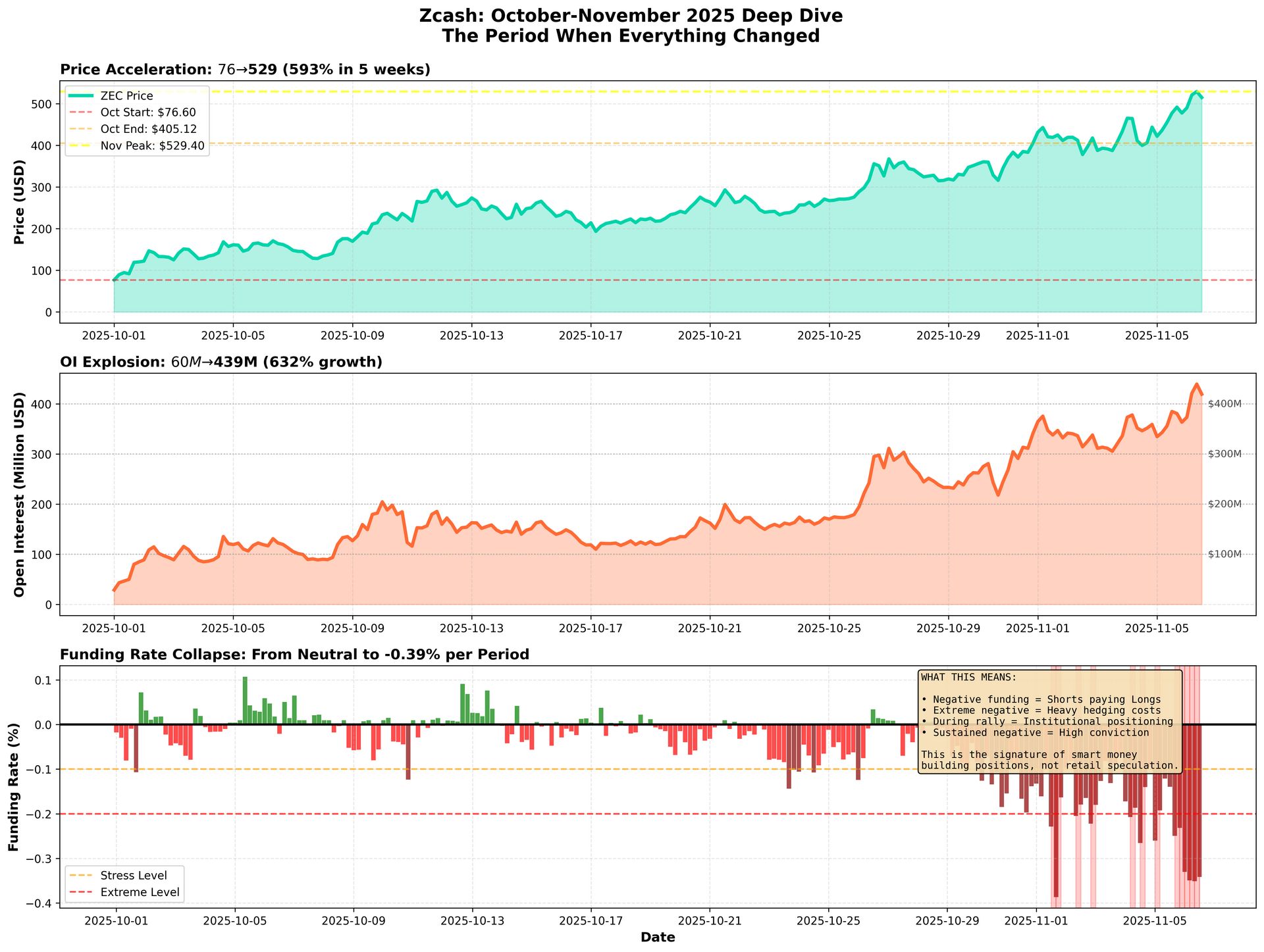 Read that again: During Zcash's most explosive rally phase, funding rates hit -141% annualized. Shorts were/are paying longs nearly 0.4% every 8 hours to maintain their positions.