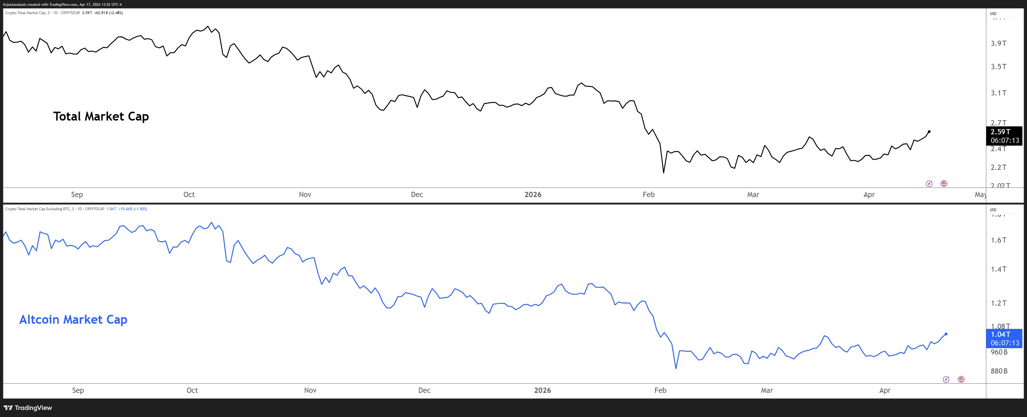 Before we dive in, here’s today’s crypto crypto’s total market and altcoin market cap charts: