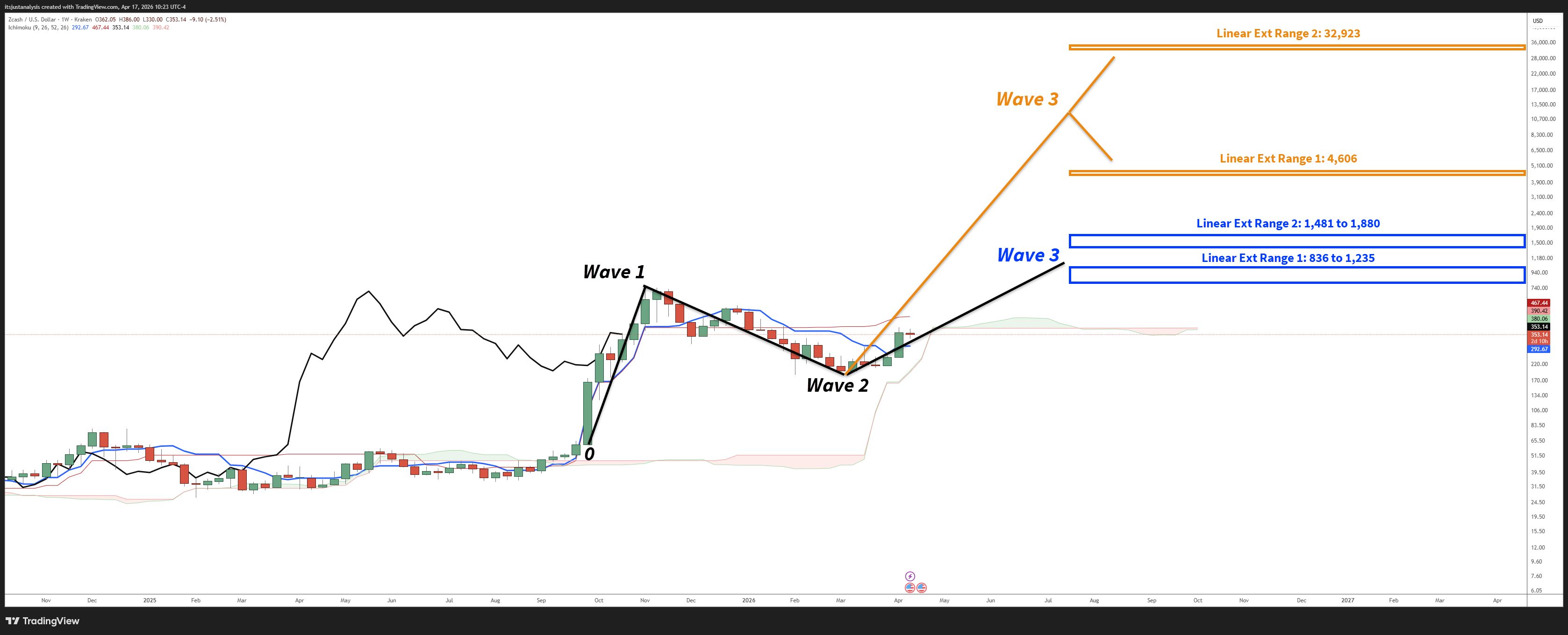On a linear basis, the measured move puts a basic Wave 3 target near 836, with the classic 1.618 extension landing around 1,235. Push it harder and the next zones come in near 1,481 and 1,880.