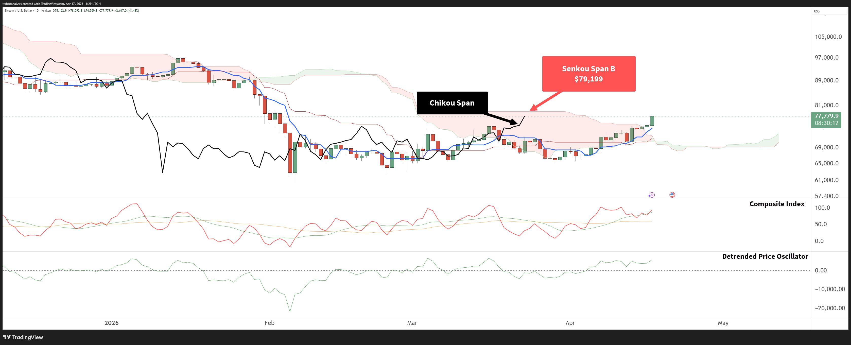 Yesterday confirmed an Ideal Bullish Ichimoku Breakout setup, and, as of this afternoon, $BTC ( ▲ 3.4% ) is still pushing higher, topping $78. But closing above $80k might be difficult.